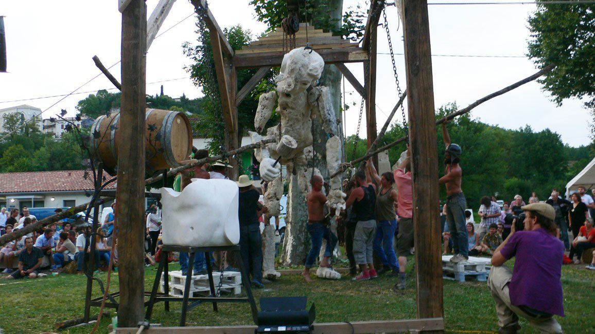 The festival of stone originates form this beautiful region of southern France with Laurent Donnadieu organising the events for a week of art, music and dance. The following images show something of the monumental task of creating a giant with a mission... This collaboration was created with Duncan Elliott and a lot of help from my friends in France, Laurent, Vincent, David, Romain to name just a few. Duncan sellected the many natural stones for the body, the metal Team connected them all and the carved aspects were added along with the stained glass eyes, which wee lit from inside the giant and became alive after dusk.