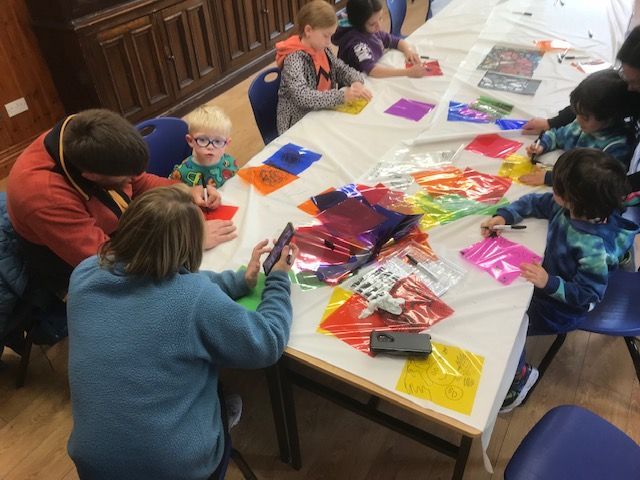 The workshops have all been a great success with many attending from across Ireland, Sligo to Castleisland and throughout West Kerry, and some from as far away as Australia and the USA. So many in fact that we needed to create another panel to accommodate all the work! All were treated to a private view of the Harry Clarke windows in the upstairs Chapel of an Diseart and then invited to make their own Mini Masterpieces in the temporary art Studio downstairs.