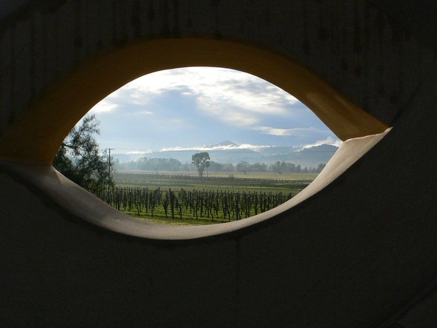 The vortex of spirals leads our eye into the aperture, itself shaped like an eye. Through this space we see the distant hill named after William Ogilvie, the founder of Denman in 1853. The significance is one of looking – specifically, looking onto and across the vineyards and the landscape beyond. We can see how this special part of the valley has been looked after by the family of vintners here and further afield to the farms beyond.