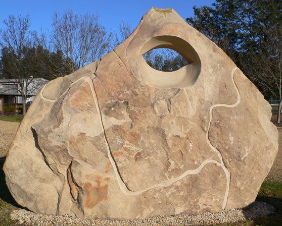 This sensational rock collection at Two Rivers Wines, was carved in 2015 by international sculptor Ben Dearnley and unveiled by iconic film star Sigrid Thornton. More than 28 tonnes of stone sourced from the vineyard were used to create this project. The stone is Triassic Narrabeen Sandstone, laid down 200 million years ago under ancient rivers and wetlands. About 15 million years ago, erupting volcanoes covered the area in basalt, which has eroded away over time, uncovering this ancient landscape. Iron in the basalt leached through the sandstone to leave the hard, red bands of ironstone that can be seen today in some cliffs, particularly along the Goulburn River. Natural springs and rivers are gradually eroding the sandstone, creating the fantastical formations and gorges to be seen in the hills behind Two Rivers and further west into the Upper Hunter Valley and south into Wollemi National Park. The region’s Narabeen Sandstone is renowned for its abundance of carved and painted Aboriginal rock art. Ben Dearnley’s work at Two Rivers directly references this ancient work and the landscape itself, with its dramatic moods and seasons – a continuous flow of change also reflected in the work at Two Rivers, where growing the vines is a labour of love in tune with nature itself.